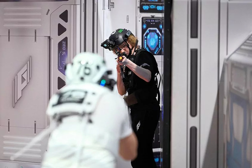 Players use Taggers (infrared shooting simulation devices) to complete missions in a real-life shooting arena.